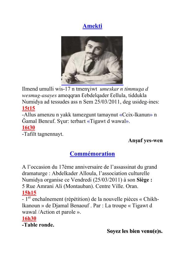 2.                  Agellid n Times, roman, internet 2007 ; à paraître aux éditions Achab, Tizi ouzou.